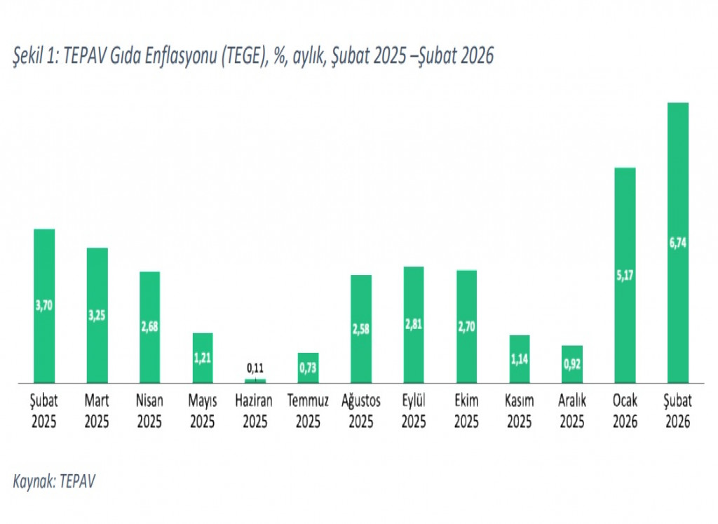 TEPAV’dan yapılan açıklamada Şubat ayında gıda fiyatlarında belirgin bir artışın gerçekleştiği vurgulandı. Şubat ayı itibariyle yıllık gıda enflasyonunun ise %33,8 olduğu aktarıldı.
