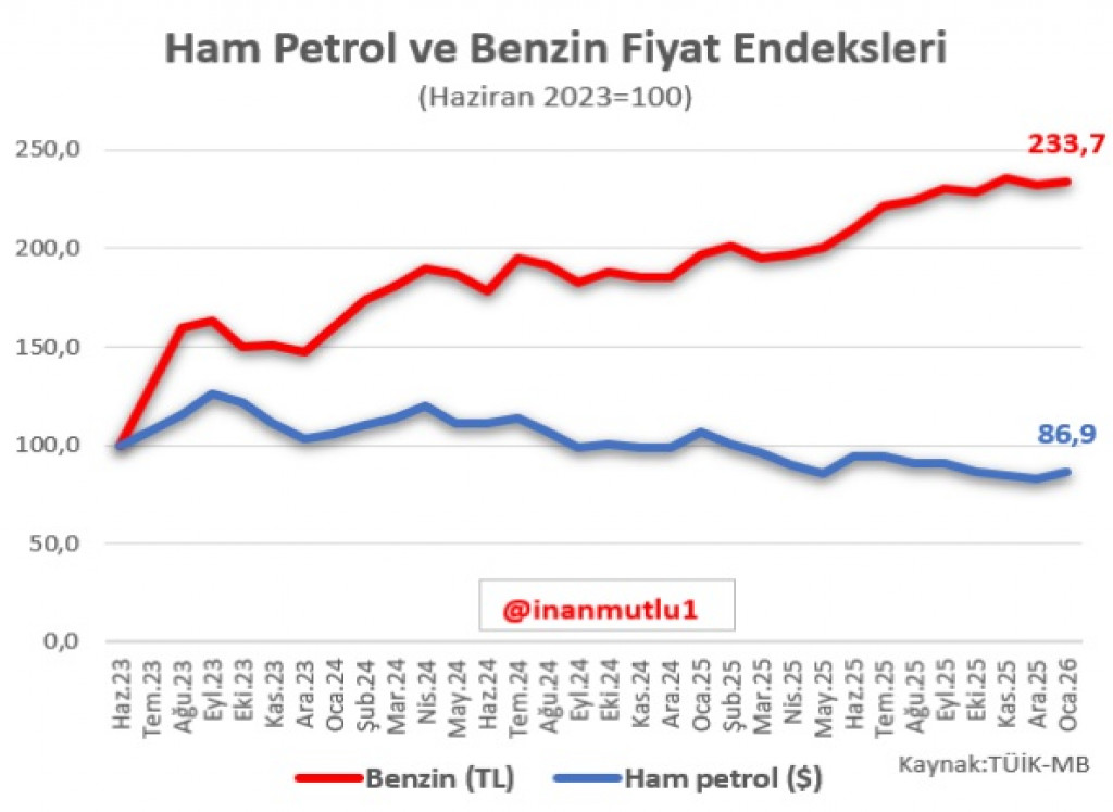 Ekonomist İnan Mutlu’nun paylaştığı grafiğe göre 2024 yılının nisan ayından bu yana dünyada ham petrolün fiyatında belirgin bir düşüş varken, Türkiye’de benzinin fiyatında belirgin bir artış var.