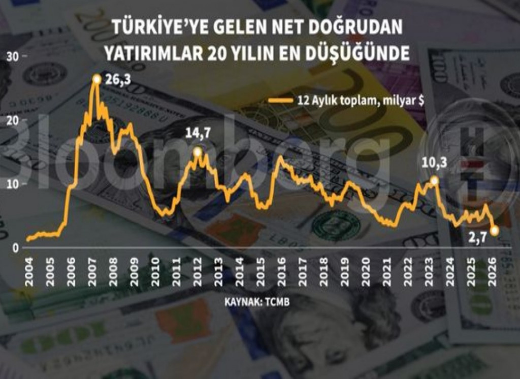bloomberght.com’un “Türkiye’ye doğrudan yatırımlar 20 yılın en düşük seviyesinde” başlıklı haberine göre ocak ayı itibariyle Türkiye'ye yıllıklandırılmış (son 12 aylık) net doğrudan yatırım girişi 2,7 milyar $ düzeyinde gerçekleşti. Söz konusu tutar 2007 yılında 26,3 milyar $, 2012’de 14,7 milyar $ ve 2023 yılında 10,3 milyar $’dı. 2023 yılından sonra yabancıların Türkiye'ye yaptığı doğrudan yatırımlar baş aşağı düştü ve 2026 yılı ocak ayı itibariyle yıllıklandırılmış olarak 2,7 milyar $’la son 20 yılın en düşük düzeyine geriledi.